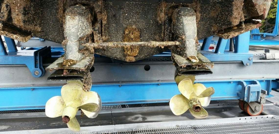 Princess 42 efter 12 måneder i vandet under lune vand temperaturer. Behandlet med Propspeed inden søsætning og ikke tager op af vandet før efter de 12 måneder.